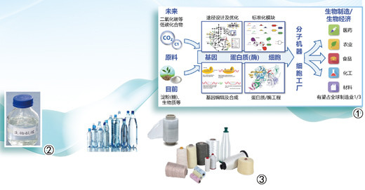 图(1):生物制造流程示意图。图(2):生物航煤样品。图(3):生物基塑料样品。